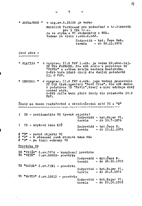 "PLATINA" v rozprac. II.S FMV 1.odb. je veden KR, ekon.taj ZÚ USA FARRAND. Dle AOK došlo k podstávce TS "PETRA" a celkem dobrým osobním kontaktům. O-Stb bude plnit úkoly dle daných požadavků II. S FMV.