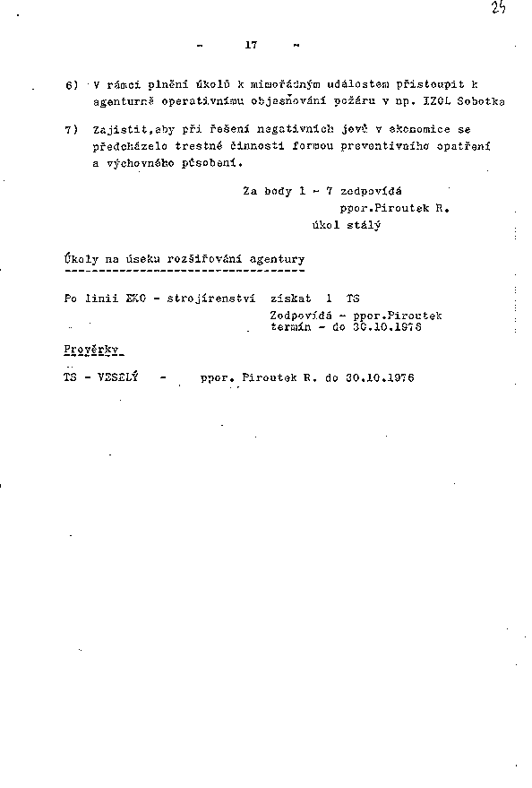 6) V rámci plnění úkolů k mimořádným událostem přistoupit k agenturně operativnímu objasňování požáru v np. IZOL Sobotka