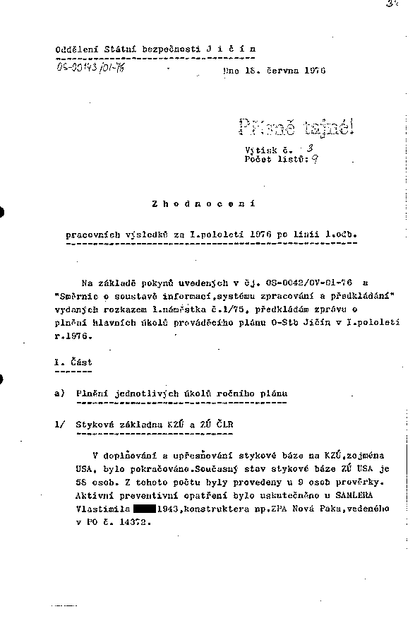 Na základě pokynů uvedených v čj. OS-0042/OV-91-76 a "Směrnic o soustavě informací, systému zpracování a předkládání" vydaných rozkazem 1.náměstka č. 1/75, předkládám zprávu o plnění hlavních úkolů prováděcího plánu O-Stb Jičín v I.pololetí r.1976.
