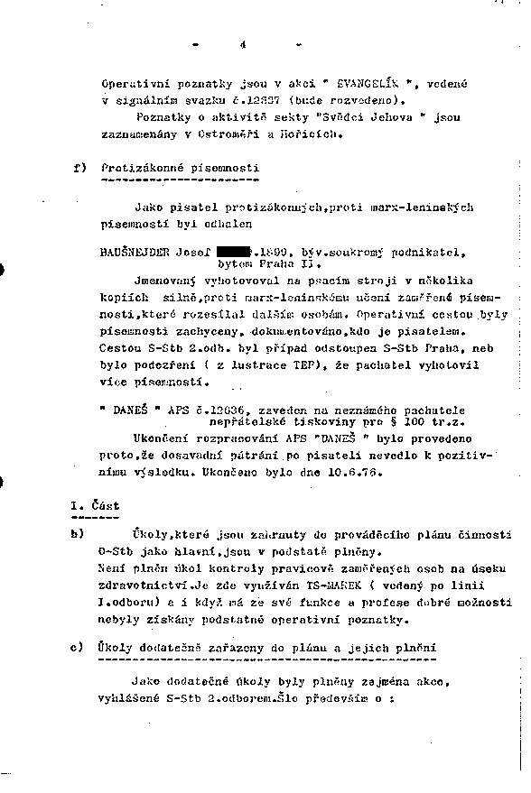 Operativní poznatky jsou v akci " EVANGELÍK ", vedené v signálním svazku č.12837 (bude rozvedeno).
