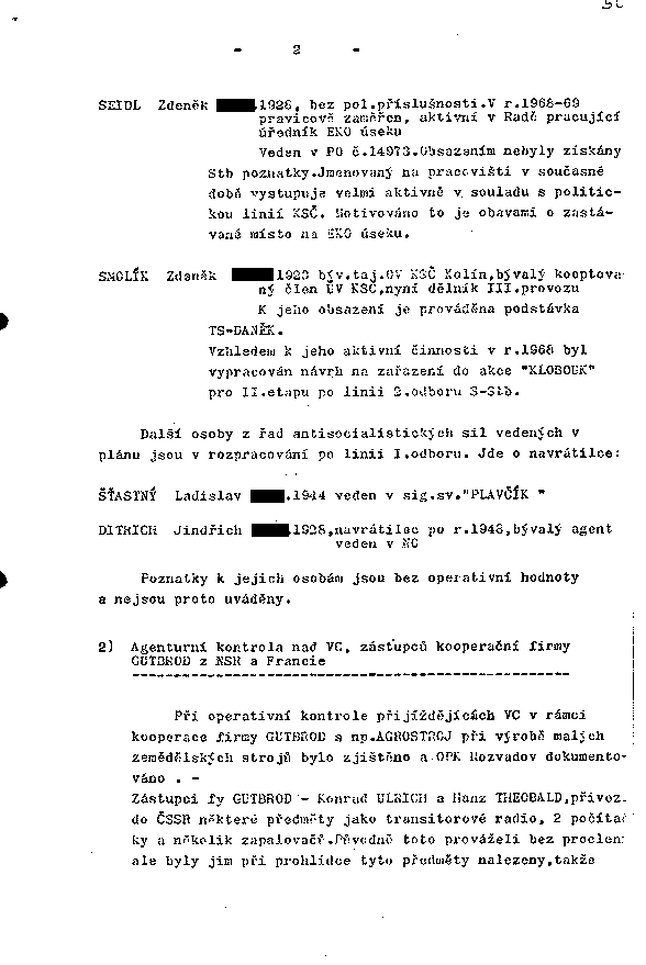 Veden v PO č. 14973. Obsazením nebyly získány Stb poznatky. Jmenovaný na pracovišti v současné době vystupuje velmi aktivně v souladu s politickou linií KSČ. Motivováno to je obavami o zastávané místo na EKO úseku.