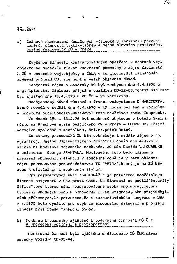 Při rozpracování akce "AKCIONÁŘ" je potvrzena nepřátelská činnost emigrantů v USA proti ČSSR. Na činnosti se podílí "Security Office", pro kteru námi rozpracovávaná osoba spolupracuje, při typování vhodných osob k pohovorům z řad emigrace, nebo přijíždějících příbuzných. Je potvrzeno, že i eucharistického kongresu v USA v r.1976 bylo využito pro styk se Slovenskou delegací a pro její činnost přislíbena finanční pomoc.