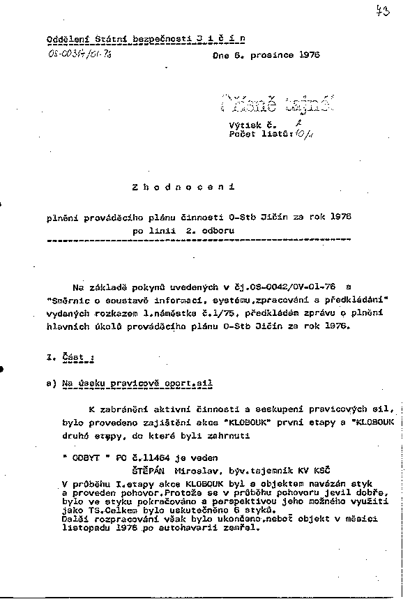 Na základě pokynů uvedených v čj.OS-0042/OV-01-76 a "Směrnic o soustavě informací, systému, zpracování a předkládání" vydaných rozkazem 1.náměstka č. 1/75, předkládám zprávu o plnění hlavních úkolů prováděcího plánu O-Stb Jičín za rok 1976.