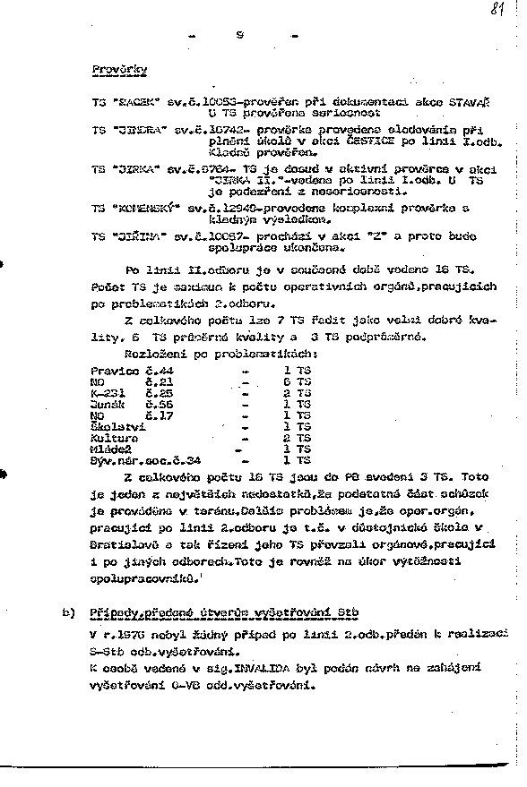 Z celkového počtu 16 TS jsou do PB svedení 3 TS. Toto je jeden z největších nedostatků, že podstatná část schůzek je prováděna v terénu. Dalším problémem je, že oper. orgán, pracující po linii 2.odboru je t.č. v důstojnické škole v Bratislavě a tak řízení jeho TS převzali orgánové, pracující i po jiných odborech. Toto je rovněž na úkor výtěžnosti spolupracovníků.