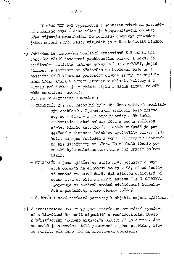 - EVANGELÍK : jsou zjišťovány stále nové poznatky o stycích objekta na duchovní osoby z KS, odkud dostává značné množství darů. Byl zjištěn opakovaný písemný styk objekta na krycí adresu HLASU AMERIKY. Projevuje se poměrně značná návštěvnost bohoslužeb a přednášek, které objekt pořádá.