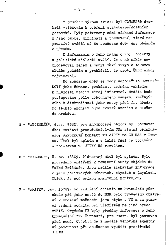S - "FILOSOF", č. sv. 16309. Plánovaný úkol byl splněn. Bylo provedeno opatření k zamezení cesty objekta do Velké Británie. Jsou nadále získávány informace o jeho politických názorech, stycích a úmyslech. Objekt je pod přímou agenturní kontrolou.