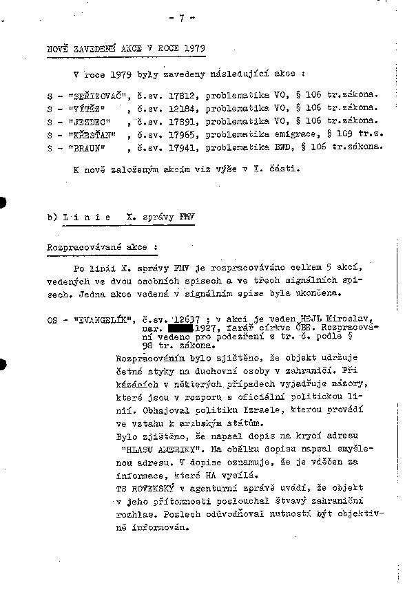 OS - "EVANGELÍK", č.sv. 12637 , v akci je veden HEJL Miroslav, nar. XXXX.1927, farář církve ČBE. Rozpracování vedeno pro podezření z tr. č. podle § 98 tr. zákona.