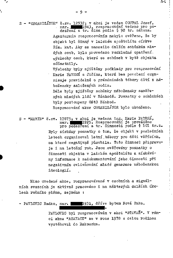 S - "MARIE" č.sv. 17875, v akci je vedena ing. Marie PATRNÁ, nar. XXXX.1925. Rozpracování je prováděno pro podezření z tr. činnosti podle § 101 tr. z.