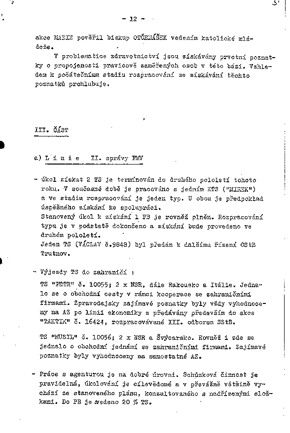 TS "PETR" č. 10055, 2 x NSR, dále Rakousko a Itálie. Jednalo se o obchodní cesty v rámci kooperace se zahraničními firmami. Zpravodajsky zajímavé poznatky byly vždy vyhodnoceny na AZ po linii ekonomiky a předávány především do akce "TAKTIK" č. 16424, rozpracovávané III. odborem SStB.