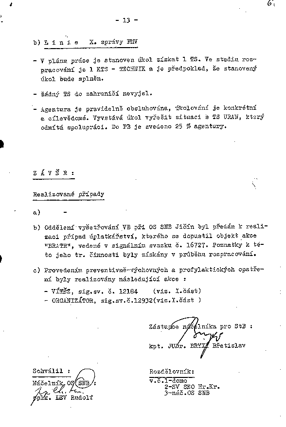 b) Oddělení vyšetřování VB při OS SNB Jičín byl předán k realizaci případ úplatkářství, kterého se dopustil objekt akce "BRATR", vedené v signálním svazku č. 16727. Poznatky k této jeho tr. činnosti byly získány v průběhu rozpracování.