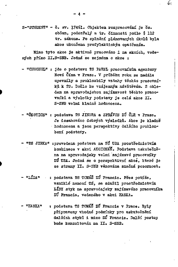 - "CHOCHOL": jde o podstavu TS PAVEL pracovníkům agentury Nová Čína v Praze. V průběhu roku se nadále upevnily a prohloubily vztahy těchto pracovníků k TS. Došlo ke vzájemným návštěvám. S ohledem na zpravodajskou zajímavost těchto pracovníků a výsledky podstavy je celá akce II. S-SNB velmi kladně hodnocena.
