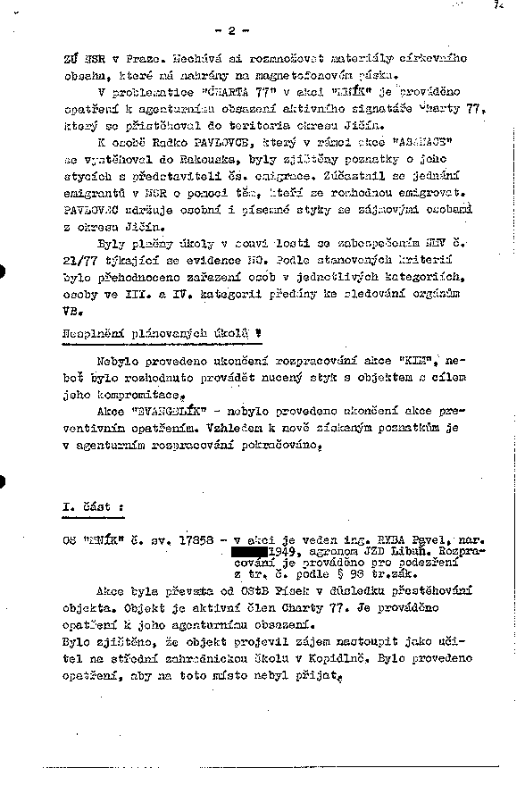 Akce byla převzata od OStB Písek v důsledku přestěhování objekta. Objekt je aktivní člen Charty 77. Je prováděno opatření k jeho agenturnímu obsazení.