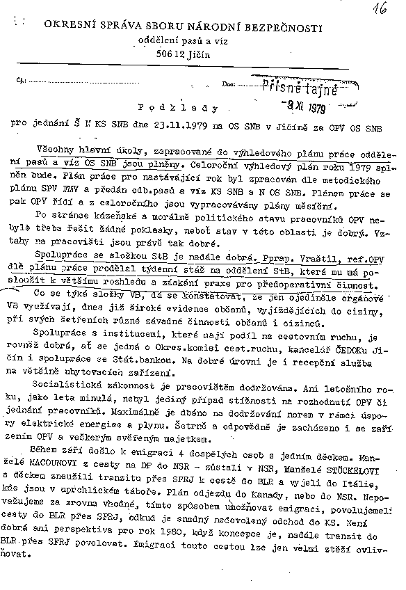 Během září došlo k emigraci 4 dospělých osob s jedním děckem. Manželé MACOUNOVI z cesty na DP do NSR - zůstali v NSR, Manželé STÖCKELOVI s děckem zneužili tranzitu přes SFRJ k cestě do BLR a vyjeli do Itálie, kde jsou v uprchlickém táboře. Plán odjezdu do Kanady, nebo do NSR. Nepovažujeme za zrovna vhodné, tímto způsobem umožňovat emigraci, povolujemeli cesty do BLR přes SFRJ, odkud je snadný nedovolený odchod do KS. Není dobrá ani perspektiva pro rok 1980, když koncepce je, nadále tranzit do BLR přes SFRJ povolovat. Emigraci touto cestou lze jen velmi ztěží ovlivňovat.
