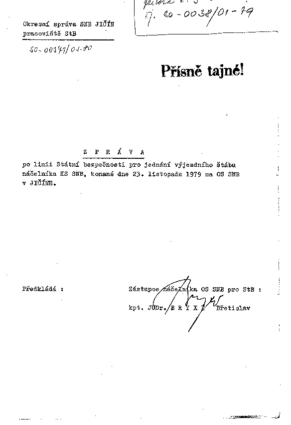 po linii Státní bezpečnosti pro jednání výjezdního štábu náčelníka KS SNB, konané dne 23. listopadu 1979 na OS SNB v JIČÍNE.