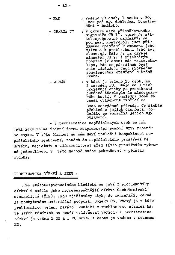- CHARTA 77 : v okrese máme přistěhovaného signatáře CH 77, který je státobezpečnostně zajímavý. Je pod naší kontrolou, jsou přijímána opatření k omezení jeho vlivu a k prohloubení jeho ag. obsazení. Dále je na okrese signatář CH 77 s přechodným pobytem (vlastní zde rekre.chalupu, kde se převážnou část roku zdržuje). Jsou prováděna součinnostní opatření s S-StB Praha.