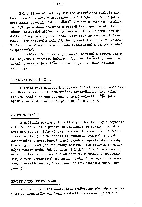 Byl zjištěn případ negativního ovlivňování mládeže náboženskou ideologií v souvislosti s laickým hnutím. Objekta akce MARIE pověřil biskup OTČENÁŠEK vedením katolické mládeže. Bylo provedeno opatření k rozpuštění nepovoleného letního tábora katolické mládeže a vytvořena situace k tomu, aby se další takový tábor již nekonal. Jsou získány prvotní informace k uskutečnění nelegálního vyučování mládeže v bytech. V plánu pro příští rok se ukládá prohloubení a zintenzivění rozpracování.
