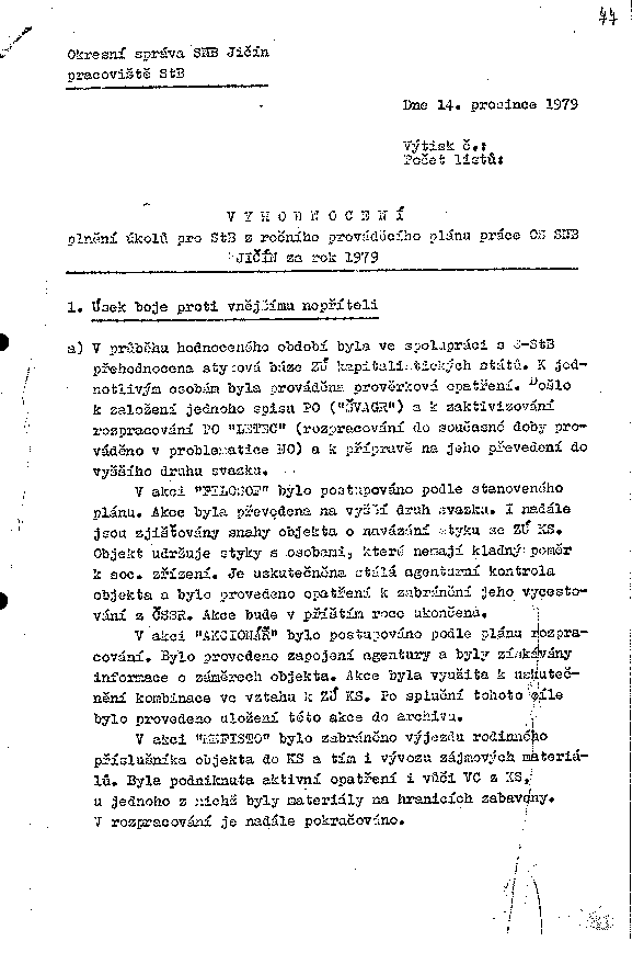 V akci "FILOSOF" bylo postupováno podle stanoveného plánu. Akce byla převedena na vyšší druh svazku. I nadále jsou zjišťovány snahy objekta o navázání styku se ZÚ KS. Objekt udržuje styky s osobami, které nemají kladný poměr k soc. zřízení. Je uskutečněna stálá agenturní kontrola objekta a bylo provedeno opatření k zabránění jeho vycestovaní z ČSSR. Akce bude v příštím roce ukončena.
