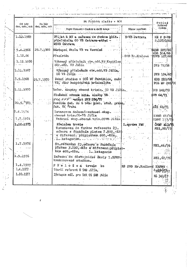 | 1.12.1965 | Přijat k MV a zařazen do funkce hlíd. příslušníka OO VB Ostrava-střed-MSVB Ostrava | S-VB Ostrava | KR N S-VB č.107/1965 | |
