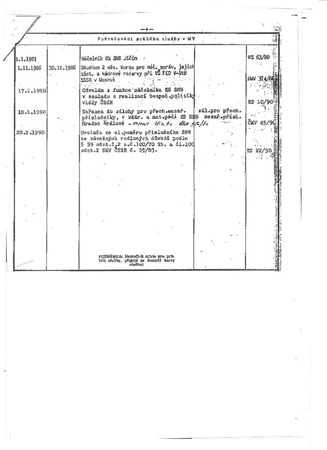 | 18.1.1990 | Zařazen do zálohy pro přech.nezař.příslušníky, v kádr. a mat.péči KS SNB Hradec Králové - VYJMUT 28.7.90 NMV xx 156/90 | zál.pro přech.nezař.přísl. | ČMV 45/90 | |