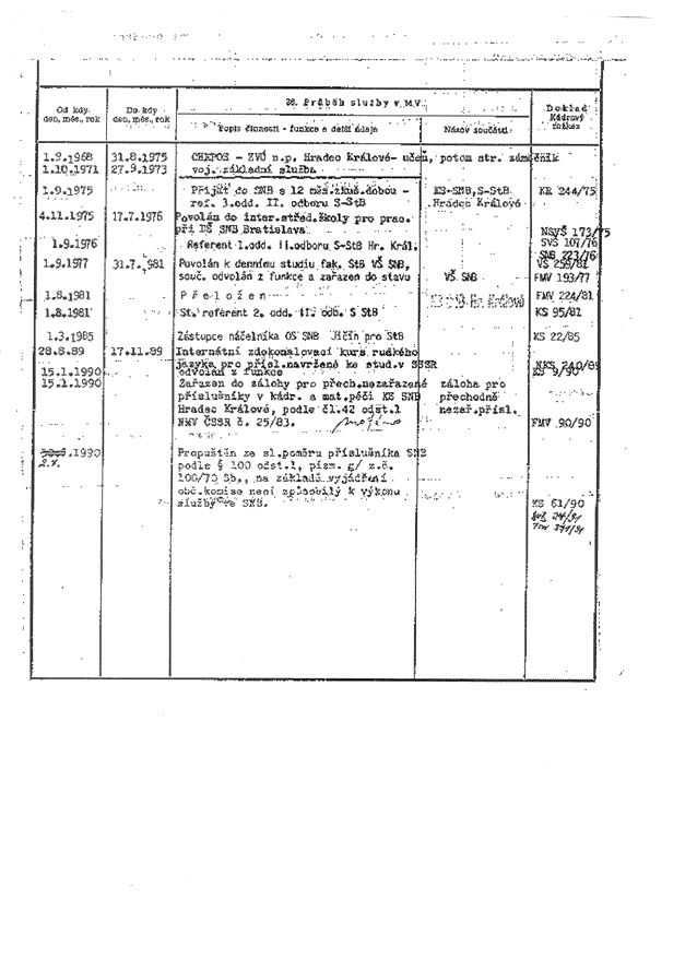 | 1.9.1975 | Přijat do SNB s 12 měs.zkuš.dobou - ref. 3.odd. II. odboru S-StB | KS-SNB, S-StB Hradec Králové | KR 244/75 | |