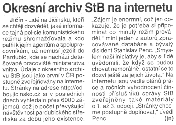 Jičín - Lidé na Jičínsku, kteří se chtějí dozvědět, jaké informace tajná policie komunistického režimu shromažďovala a kdo patřil k jejím agentům a spolupracovníkům, už nemusí jezdit do Pardubic, kde se nachází detašované pracoviště ministerstva vnitra. Údaje z okresního archivu StB jsou jako první v ČR postupně zveřejněňovány na internetu. Stránky na adrese http://odboj.jicinsko.cz si v posledních dnech vyhledalo přes 6000 zájemců, což je počet převyšující návštěvnost pardubického střediska za dobu jeho existence. "Zájem je enormní, což jen dokazuje, že je potřeba si připomínat co minulý režim prováděl," míní jeden z autorů zpracovávané databáze a bývalý disident Stanislav Penc. "Smyslem naší iniciativy je, aby si lidé uvědomili, že když se budou chovat nemravně, ostatní se to dozví ještě za jejich života." Na internetu jsou vedle plánů práce a ročních vyhodnocení činnosti příslušníků správy StB zveřejněny také materiály o 1. až 3. odboji. "Stránky chceme postupně doplňovat," uvedl Penc. (jn)